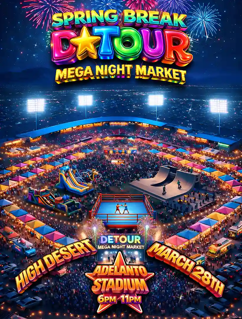 Detour SoCal is back with the Spring Break Mega Night Market, taking over Adelanto Stadium for one unforgettable night on Saturday, March 28, 2026, from 6PM to 11PM.